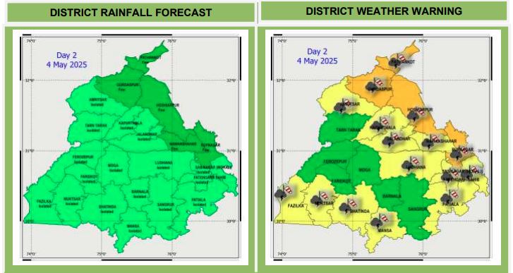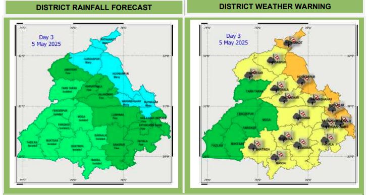 ਕੱਲ੍ਹ ਯਾਨੀ 5 ਮਈ ਨੂੰ ਵੀ ਸੂਬੇ ਭਰ ਵਿਚ ਮੀਂਹ ਦੀ ਸੰਭਾਵਨਾ ਜਤਾਈ ਗਈ ਹੈ। ਵਿਭਾਗ ਮੁਤਾਬਕ ਪਠਾਨਕੋਟ, ਹੁਸ਼ਿਆਰਪੁਰ, ਰੂਪਨਗਰ ਤੇ ਨਵਾਂਸ਼ਹਿਰ 'ਚ ਮੀਂਹ ਦਾ ਅਸਰ ਸਭ ਤੋਂ ਵੱਧ ਦਿਸੇਗਾ। ਇਨ੍ਹਾਂ ਜ਼ਿਲ੍ਹਿਆਂ ਲਈ ਵਿਭਾਗ ਵੱਲੋਂ ਓਰੇਂਜ ਅਲਰਟ ਵੀ ਜਾਰੀ ਕੀਤਾ ਗਿਆ ਹੈ। ਇਸ ਦੇ ਨਾਲ ਹੀ ਗੁਰਦਾਸਪੁਰ, ਅੰਮ੍ਰਿਤਸਰ, ਨਵਾਂਸ਼ਹਿਰ, ਕਪੂਰਥਲਾ, ਜਲੰਧਰ, ਲੁਧਿਆਣਾ, ਸੰਗਰੂਰ, ਫ਼ਤਿਹਗੜ੍ਹ ਸਾਹਿਬ, ਪਟਿਆਲਾ ਅਤੇ ਮਾਲੇਰਕੋਟਲਾ ਲਈ ਯੈਲੋ ਅਲਰਟ ਜਾਰੀ ਕੀਤਾ ਗਿਆ ਹੈ।
