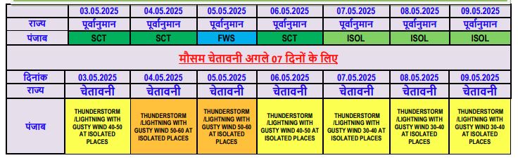 ਭਾਰਤ ਮੌਸਮ ਵਿਗਿਆਨ ਕੇਂਦਰ ਵੱਲੋਂ 9 ਮਈ ਤਕ ਸੂਬੇ ਵਿਚ ਹਨੇਰੀ ਦੇ ਨਾਲ ਬਾਰਿਸ਼ ਦੀ ਭਵਿੱਖਬਾਣੀ ਕੀਤੀ ਗਈ ਹੈ। ਇਸ ਦੇ ਨਾਲ ਹੀ ਅੱਜ ਅਤੇ ਕੱਲ੍ਹ ਲਈ ਵਿਭਾਗ ਨੇ ਕਈ ਜ਼ਿਲ੍ਹਿਆਂ 'ਚ ਓਰੇਂਜ ਤਾਂ ਕਈਆਂ ਲਈ ਯੈਲੋ ਅਲਰਟ ਜਾਰੀ ਕੀਤਾ ਹੈ। ਵਿਭਾਗ ਵੱਲੋਂ ਅੱਜ ਸੂਬੇ ਭਰ ਵਿਚ ਹਲਕੀ ਬਾਰਿਸ਼ ਦੀ ਸੰਭਾਵਨਾ ਜਤਾਈ ਗਈ ਹੈ। ਪਠਾਨਕੋਟ, ਗੁਰਦਾਸਪੁਰ ਅਤੇ ਹੁਸ਼ਿਆਰਪੁਰ ਵਿਚ ਮੀਂਹ ਦੇ ਨਾਲ-ਨਾਲ ਹਨੇਰੀ-ਤੂਫ਼ਾਨ ਲਈ ਓਰੇਂਜ ਅਲਰਟ ਜਾਰੀ ਕੀਤਾ ਗਿਆ ਹੈ। ਇਸ ਦੇ ਨਾਲ ਹੀ ਅੰਮ੍ਰਿਤਸਰ, ਨਵਾਂਸ਼ਹਿਰ, ਕਪੂਰਥਲਾ, ਜਲੰਧਰ, ਫਾਜ਼ਿਲਕਾ, ਮੁਕਤਸਰ, ਬਠਿੰਡਾ, ਲੁਧਿਆਣਾ, ਮਾਨਸਾ, ਫ਼ਤਹਿਗੜ੍ਹ ਸਾਹਿਬ, ਪਟਿਆਲਾ ਅਤੇ ਮਾਲੇਰਕੋਟਲਾ ਲਈ ਯੈਲੋ ਅਲਰਟ ਜਾਰੀ ਕੀਤਾ ਗਿਆ ਹੈ।