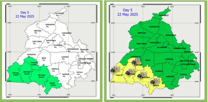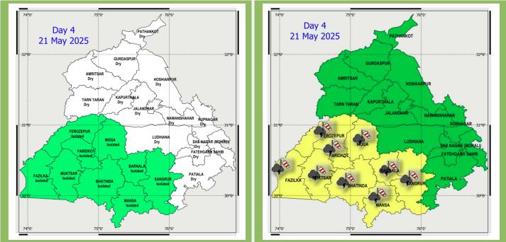 ਇਸ ਤੋਂ ਇਲਾਵਾ 21 ਅਤੇ 22 ਨੂੰ ਮਾਲਵੇ ਦੇ ਕਈ ਜ਼ਿਲ੍ਹਿਆਂ ਵਿਚ ਮੀਂਹ-ਹਨੇਰੀ ਦੀ ਸੰਭਾਵਨਾ ਦੇ ਚਲਦਿਆਂ ਯੈਲੋ ਅਲਰਟ ਜਾਰੀ ਕੀਤਾ ਗਿਆ ਹੈ। ਇਸ ਦੌਰਾਨ ਦੋਆਬੇ ਤੇ ਮਾਝੇ ਦੇ ਜ਼ਿਆਦਾਤਰ ਜ਼ਿਲ੍ਹਿਆਂ ਵਿਚ ਮੌਸਮ ਸਾਫ਼ ਰਹਿਣ ਦੀ ਸੰਭਾਵਨਾ ਜਤਾਈ ਗਈ ਹੈ।