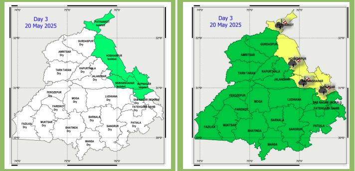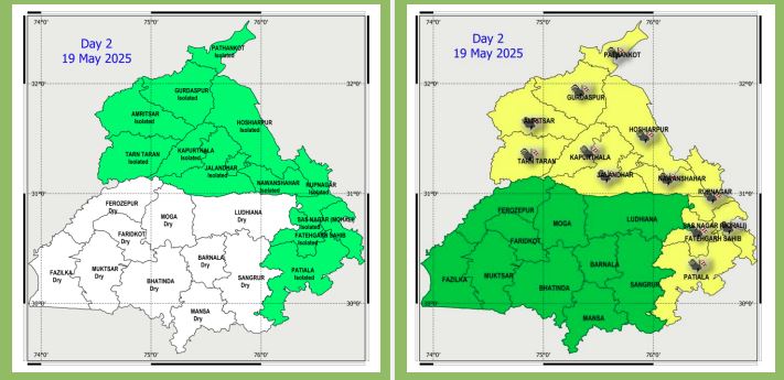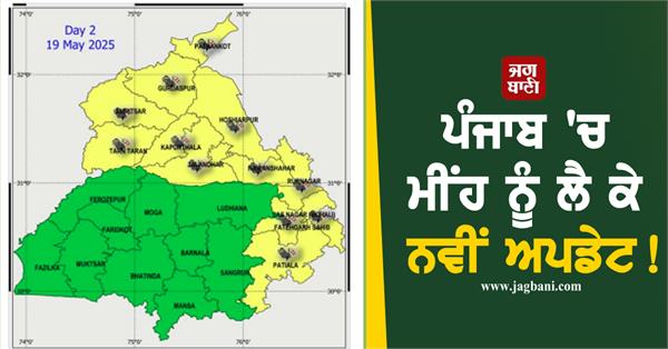 ਇਸੇ ਤਰ੍ਹਾਂ ਭਲਕੇ ਯਾਨੀ 20 ਮਈ ਨੂੰ ਪਠਾਨਕੋਟ, ਹੁਸ਼ਿਆਰਪੁਰ, ਨਵਾਂਸ਼ਹਿਰ ਤੇ ਰੂਪਨਗਰ ਵਿਚ ਮੀਂਹ-ਹਨੇਰੀ ਦੀ ਸੰਭਾਵਨਾ ਹੈ। ਵਿਭਾਗ ਨੇ ਇਨ੍ਹਾਂ ਜ਼ਿਲ੍ਹਿਆਂ ਲਈ ਯੈਲੋ ਅਲਰਟ ਜਾਰੀ ਕੀਤਾ ਹੈ। ਹਾਲਾਂਕਿ ਇਸ ਦੌਰਾਨ ਸੂਬੇ ਵਿਚ ਬਾਕੀ ਥਾਵਾਂ 'ਤੇ ਮੌਸਮ ਸਾਫ਼ ਰਹੇਗਾ।