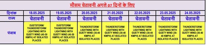 ਮੌਸਮ ਵਿਭਾਗ ਵੱਲੋਂ 18 ਤੋਂ 24 ਮਈ ਤਕ ਸੂਬੇ ਦੇ ਮੌਸਮ ਦੀ ਪੇਸ਼ਨਗੋਈ ਕੀਤੀ ਗਈ ਹੈ ਤੇ ਇਸ ਪੂਰੇ ਹਫ਼ਤੇ ਸੂਬੇ ਵਿਚ ਮੀਂਹ-ਹਨੇਰੀ ਦਾ ਸੰਭਾਵਨਾ ਜਤਾਈ ਹੈ। ਮੌਸਮ ਵਿਭਾਗ ਮੁਤਾਬਕ ਅੱਜ ਪਠਾਨਕੋਟ, ਗੁਰਦਾਸਪੁਰ, ਹੁਸ਼ਿਆਰਪੁਰ, ਨਵਾਂਸ਼ਹਿਰ, ਅੰਮ੍ਰਿਤਸਰ, ਤਰਨ ਤਾਰਨ, ਕਪੂਰਥਲਾ, ਜਲੰਧਰ, ਰੂਪਨਗਰ, ਐੱਸ.ਏ.ਐੱਸ.ਨਗਰ, ਫ਼ਤਹਿਗੜ੍ਹ ਸਾਹਿਬ ਅਤੇ ਪਟਿਆਲਾ ਵਿਚ ਮੀਂਹ ਦੇ ਅਸਾਰ ਹਨ। ਇਸ ਦੇ ਨਾਲ ਹੀ ਇਨ੍ਹਾਂ ਜ਼ਿਲ੍ਹਿਆਂ ਵਿਚ ਹਨੇਰੀ-ਤੂਫ਼ਾਨ ਦੀ ਵੀ ਸੰਭਾਵਨਾ ਹੈ, ਜਿਸ ਦੇ ਮੱਦੇਨਜ਼ਰ ਵਿਭਾਗ ਨੇ ਇੱਥੇ ਯੈਲੋ ਅਲਰਟ ਜਾਰੀ ਕੀਤਾ ਹੈ।