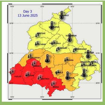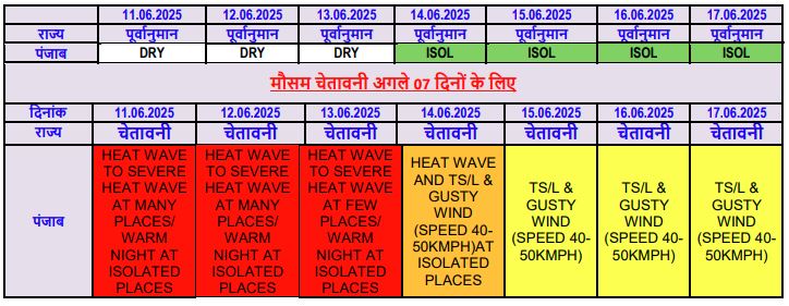 ਮੌਸਮ ਵਿਭਾਗ ਵੱਲੋਂ ਜਾਰੀ ਕੀਤੇ ਗਏ ਬੁਲੇਟਿਨ ’ਚ ਉੱਤਰ-ਪੱਛਮੀ ਭਾਰਤ ’ਚ ਗਰਮੀ ਦੀ ਲਹਿਰ ਤੋਂ ਲੈ ਕੇ ਗੰਭੀਰ ਗਰਮੀ ਦੀ ਲਹਿਰ ਦੀਆਂ ਸਥਿਤੀਆਂ 13 ਜੂਨ ਤੱਕ ਜਾਰੀ ਰਹਿਣ ਤੇ ਉਸ ਤੋਂ ਬਾਅਦ ਘੱਟ ਹੋਣ ਦੇ ਆਸਾਰ ਹਨ। 14 ਤੋਂ 17 ਜੂਨ ਦੌਰਾਨ ਪੰਜਾਬ ਦੇ ਕੁਝ ਹਿੱਸਿਆਂ ’ਚ ਗਰਜ, ਬਿਜਲੀ ਤੇ 40-50 ਕਿਲੋਮੀਟਰ ਪ੍ਰਤੀ ਘੰਟਾ ਦੀ ਰਫ਼ਤਾਰ ਵਾਲੀਆਂ ਤੇਜ਼ ਹਵਾਵਾਂ ਨਾਲ ਹਲਕੇ ਤੋਂ ਦਰਮਿਆਨਾ ਮੀਂਹ ਪੈਣ ਦੀ ਸੰਭਾਵਨਾ ਹੈ। ਹਾਲਾਂਕਿ ਇਸ ਦੌਰਾਨ ਪੰਜਾਬ ਦੇ ਕੁਝ ਕੁ ਜ਼ਿਲ੍ਹਿਆਂ ਵਿਚ ਹੀ ਬਾਰਿਸ਼ ਹੋਵੇਗੀ, ਪਰ ਉਸ ਨਾਲ ਬਾਕੀ ਜ਼ਿਲ੍ਹਿਆਂ ਦੇ ਤਾਪਮਾਨ ਵਿਚ ਹਲਕੀ ਗਿਰਾਵਟ ਆਉਣ ਦੀ ਆਸ ਜਤਾਈ ਜਾ ਰਹੀ ਹੈ।