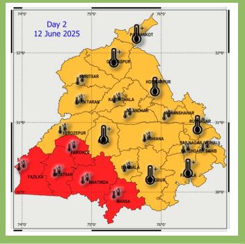 ਮੌਸਮ ਵਿਭਾਗ ਵੱਲੋਂ ਅੱਜ ਤੇ ਕੱਲ੍ਹ ਯਾਨੀ 12 ਤੇ 13 ਜੂਨ ਨੂੰ ਫ਼ਰੀਦਕੋਟ, ਫਾਜ਼ਿਲਕਾ, ਮੁਕਤਸਰ, ਬਠਿੰਡਾ ਅਤੇ ਮਾਨਸਾ 'ਚ ਲੂ ਦਾ Red Alert ਜਾਰੀ ਕੀਤਾ ਗਿਆ ਹੈ। ਉੱਥੇ ਹੀ ਬਾਕੀ ਜ਼ਿਲ੍ਹਿਆਂ ਵਿਚ ਵੀ ਅੱਜ ਲੂ ਦਾ ਓਰੇਂਜ ਅਲਰਟ ਜਾਰੀ ਕੀਤਾ ਗਿਆ ਹੈ। ਇਸ ਦੇ ਨਾਲ ਹੀ ਵਿਭਾਗ ਨੇ ਜ਼ਿਆਦਾਤਰ ਜ਼ਿਲ੍ਹਿਆਂ ਵਿਚ Warm Night Alert ਜਾਰੀ ਕੀਤਾ ਹੈ, ਜਿਸ ਦਾ ਸਿੱਧਾ-ਸਿੱਧਾ ਮਤਲਬ ਹੈ ਕਿ ਰਾਤ ਵੇਲੇ ਵੀ ਤਾਪਮਾਨ ਵਿਚ ਜ਼ਿਆਦਾ ਗਿਰਾਵਟ ਨਹੀਂ ਆਵੇਗੀ ਤੇ ਲੋਕਾਂ ਨੂੰ ਗਰਮੀ ਤੋਂ ਕੋਈ ਰਾਹਤ ਨਹੀਂ ਮਿਲੇਗੀ।