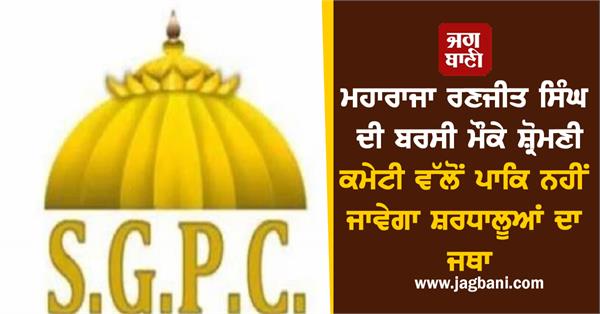 ਅੰਮ੍ਰਿਤਸਰ(ਸਰਬਜੀਤ)-ਸ਼ੇਰੇ ਪੰਜਾਬ ਮਹਾਰਾਜਾ ਰਣਜੀਤ ਸਿੰਘ ਦੀ 29 ਜੂਨ ਨੂੰ ਮਨਾਈ ਜਾ ਰਹੀ ਬਰਸੀ ਮੌਕੇ ਪਾਕਿਸਤਾਨ ਵਿਖੇ ਹੋਣ ਵਾਲੇ ਸਮਾਗਮਾਂ ਵਿਚ ਸ਼ਮੂਲੀਅਤ ਲਈ ਸ਼੍ਰੋਮਣੀ ਗੁਰਦੁਆਰਾ ਪ੍ਰਬੰਧਕ ਕਮੇਟੀ ਵੱਲੋਂ ਸਿੱਖ ਸ਼ਰਧਾਲੂਆਂ ਦਾ ਜਥਾ ਨਹੀਂ ਭੇਜਿਆ ਜਾਵੇਗਾ। ਇਸ ਸਬੰਧੀ ਜਾਣਕਾਰੀ ਦਿੰਦਿਆਂ ਸ਼੍ਰੋਮਣੀ ਕਮੇਟੀ ਦੇ ਸਕੱਤਰ ਪ੍ਰਤਾਪ ਸਿੰਘ ਨੇ ਦੱਸਿਆ ਕਿ ਸਿੱਖ ਸ਼ਰਧਾਲੂਆਂ ਨੇ ਮਹਾਰਾਜਾ ਰਣਜੀਤ ਸਿੰਘ ਦੀ ਬਰਸੀ ਮੌਕੇ ਪਾਕਿਸਤਾਨ ਜਾਣ ਲਈ ਆਪਣੇ ਪਾਸਪੋਰਟ ਸ਼੍ਰੋਮਣੀ ਕਮੇਟੀ ਦਫ਼ਤਰ ਦੇ ਯਾਤਰਾ ਵਿਭਾਗ ਵਿਖੇ ਜਮ੍ਹਾਂ ਕਰਵਾਏ ਸਨ।