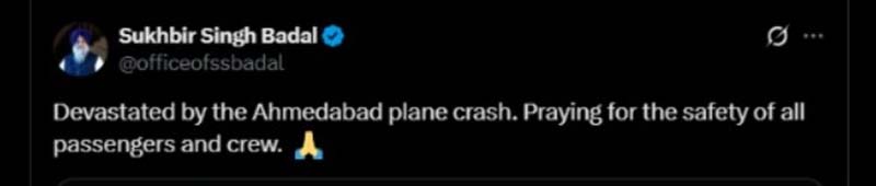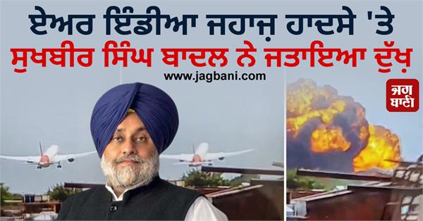 ਜਲੰਧਰ/ਚੰਡੀਗੜ੍ਹ (ਵੈੱਬ ਡੈਸਕ)- ਗੁਜਰਾਤ ਦੇ ਅਹਿਮਦਾਬਾਦ 'ਚ ਏਅਰ ਇੰਡੀਆ ਦਾ ਜਹਾਜ਼ B787VT-ANB ਕਰੈਸ਼ ਹੋ ਗਿਆ। ਕ੍ਰੈਸ਼ ਹੋਏ ਜਹਾਜ਼ ਵਿਚ 242 ਯਾਤਰੀ ਸਵਾਰ ਸਨ, ਜਿਨ੍ਹਾਂ ਵਿੱਚ 2 ਪਾਇਲਟ ਅਤੇ 10 ਕੈਬਿਨ ਕਰੂ ਸ਼ਾਮਲ ਸਨ। ਜਹਾਜ਼ ਕਰੈਸ਼ ਹਾਦਸੇ 'ਤੇ ਸ਼੍ਰੋਮਣੀ ਅਕਾਲੀ ਦਲ ਦੇ ਪ੍ਰਧਾਨ ਸੁਖਬੀਰ ਸਿੰਘ ਬਾਦਲ ਨੇ ਦੁੱਖ਼ ਜਤਾਇਆ ਹੈ। ਉਨ੍ਹਾਂ ਕਿਹਾ ਕਿ ਅਹਿਮਦਾਬਾਦ ਜਹਾਜ਼ ਹਾਦਸੇ ਤੋਂ ਦੁਖ਼ੀ ਹਾਂ। ਸਾਰੇ ਯਾਤਰੀਆਂ ਅਤੇ ਚਾਲਕ ਦਲ ਦੀ ਸੁਰੱਖਿਆ ਲਈ ਪ੍ਰਾਰਥਨਾ ਕਰਦਾ ਹਾਂ।