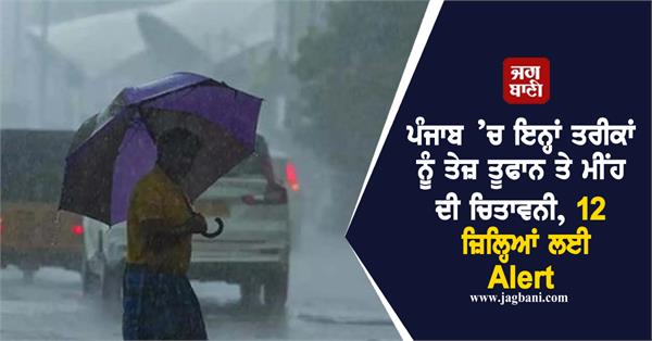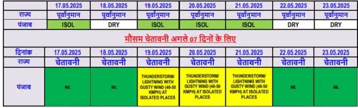 ਮੌਸਮ ਵਿਭਾਗ ਦੀ ਜਾਣਕਾਰੀ ਮੁਤਾਬਕ 19 ਮਈ ਨੂੰ ਪੰਜਾਬ ਦੇ 12 ਜ਼ਿਲ੍ਹਿਆਂ- ਪਠਾਨਕੋਟ, ਗੁਰਦਾਸਪੁਰ, ਹੁਸ਼ਿਆਰਪੁਰ, ਅੰਮ੍ਰਿਤਸਰ, ਕਪੂਰਥਲਾ, ਜਲੰਧਰ, ਨਵਾਂਸ਼ਹਿਰ, ਰੂਪਨਗਰ, ਲੁਧਿਆਣਾ, ਐਸਏਐਸ ਨਗਰ, ਫਤਿਹਗੜ੍ਹ ਸਾਹਿਬ, ਪਟਿਆਲਾ ਜ਼ਿਲ੍ਹਿਆਂ ਵਿੱਚ ਕੁਝ ਥਾਵਾਂ 'ਤੇ ਹਲਕੀ ਤੋਂ ਦਰਮਿਆਨੀ ਬਾਰਿਸ਼ ਹੋਣ ਦੀ ਸੰਭਾਵਨਾ ਹੈ। ਪਠਾਨਕੋਟ, ਗੁਰਦਾਸਪੁਰ, ਹੁਸ਼ਿਆਰਪੁਰ, ਅੰਮ੍ਰਿਤਸਰ, ਕਪੂਰਥਲਾ, ਜਲੰਧਰ, ਨਵਾਂਸ਼ਹਿਰ, ਰੂਪਨਗਰ, ਲੁਧਿਆਣਾ, ਐਸਏਐਸ ਨਗਰ, ਫਤਿਹਗੜ੍ਹ ਸਾਹਿਬ, ਪਟਿਆਲਾ ਜ਼ਿਲ੍ਹਿਆਂ ਵਿੱਚ ਕੁਝ ਥਾਵਾਂ 'ਤੇ ਤੇਜ਼ ਹਵਾਵਾਂ (40-50 ਕਿਲੋਮੀਟਰ ਪ੍ਰਤੀ ਘੰਟਾ ਦੀ ਰਫ਼ਤਾਰ) ਦੇ ਨਾਲ ਗਰਜ/ਬਿਜਲੀ ਦੇ ਨਾਲ-ਨਾਲ ਤੂਫ਼ਾਨ ਆਉਣ ਦੀ ਸੰਭਾਵਨਾ ਹੈ। ਇਸ ਦੇ ਨਾਲ ਹੀ 20 ਮਈ ਨੂੰ ਪਠਾਨਕੋਟ, ਹੁਸ਼ਿਆਰਪੁਰ, ਨਵਾਂਸ਼ਹਿਰ, ਰੂਪਨਗਰ ਜ਼ਿਲ੍ਹਿਆਂ ਵਿੱਚ ਕੁਝ ਥਾਵਾਂ 'ਤੇ ਮੀਂਹ ਪੈਣ ਦੀ ਸੰਭਾਵਨਾ ਹੈ। ਪਠਾਨਕੋਟ, ਹੁਸ਼ਿਆਰਪੁਰ, ਨਵਾਂਸ਼ਹਿਰ, ਰੂਪਨਗਰ ਜ਼ਿਲ੍ਹਿਆਂ ਵਿੱਚ ਕੁਝ ਥਾਵਾਂ 'ਤੇ ਗਰਜ/ਬਿਜਲੀ/ਤੇਜ਼ ਹਵਾਵਾਂ (40-50 ਕਿਲੋਮੀਟਰ ਪ੍ਰਤੀ ਘੰਟਾ ਦੀ ਗਤੀ) ਦੀ ਸੰਭਾਵਨਾ ਹੈ।