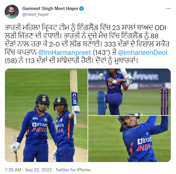 ਉਥੇ ਹੀ ਪੰਜਾਬ ਦੇ ਖੇਡ ਮੰਤਰੀ ਗੁਰਮੀਤ ਸਿੰਘ ਮੀਤ ਹੇਅਰ ਨੇ ਟਵੀਟ ਕਰਕੇ ਭਾਰਤੀ ਮਹਿਲਾ ਟੀਮ ਨੂੰ ਵਧਾਈ ਦਿੱਤੀ ਹੈ। ਉਨ੍ਹਾਂ ਟਵੀਟ ਕਰਦੇ ਹੋਏ ਲਿਖਿਆ, 'ਭਾਰਤੀ ਮਹਿਲਾ ਕ੍ਰਿਕਟ ਟੀਮ ਨੂੰ ਇੰਗਲੈਂਡ ਵਿੱਚ 23 ਸਾਲਾਂ ਬਾਅਦ ODI ਲੜੀ ਜਿੱਤਣ 'ਤੇ ਵਧਾਈ। ਭਾਰਤੀ ਨੇ ਦੂਜੇ ਮੈਚ ਵਿੱਚ ਇੰਗਲੈਂਡ ਨੂੰ 88 ਦੌੜਾਂ ਨਾਲ ਹਰਾ ਕੇ 2-0 ਦੀ ਲੀਡ ਬਣਾਈ। 333 ਦੌੜਾਂ ਦੇ ਵਿਸ਼ਾਲ ਸਕੋਰ ਵਿੱਚ ਕਪਤਾਨ ਹਰਮਨਪ੍ਰੀਤ (143) ਤੇ ਹਰਲੀਨ ਦਿਓਲ (58) ਨੇ 113 ਦੌੜਾਂ ਦੀ ਸਾਂਝੇਦਾਰੀ ਕੀਤੀ। ਦੋਵਾਂ ਨੂੰ ਮੁਬਾਰਕਾਂ।'