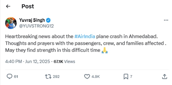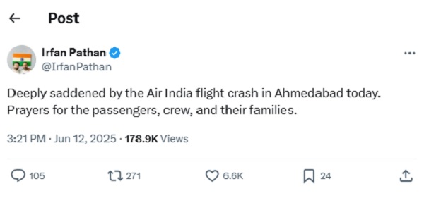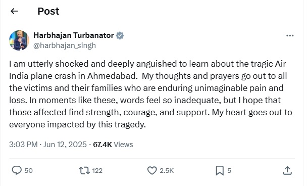 ਹਰਭਜਨ ਸਿੰਘ ਨੇ ਐੱਕਸ 'ਤੇ ਸੰਦੇਸ਼ 'ਚ ਕਿਹਾ, 'ਮੈਨੂੰ ਇਹ ਜਾਣ ਕੇ ਬਹੁਤ ਦੁੱਖ ਅਤੇ ਸਦਮਾ ਲੱਗਾ ਹੈ ਕਿ ਅਹਿਮਦਾਬਾਦ ਵਿੱਚ ਏਅਰ ਇੰਡੀਆ ਦਾ ਜਹਾਜ਼ ਹਾਦਸਾਗ੍ਰਸਤ ਹੋ ਗਿਆ ਹੈ। ਮੇਰੀਆਂ ਸੰਵੇਦਨਾਵਾਂ ਅਤੇ ਪ੍ਰਾਰਥਨਾਵਾਂ ਉਨ੍ਹਾਂ ਸਾਰੇ ਪੀੜਤਾਂ ਅਤੇ ਉਨ੍ਹਾਂ ਦੇ ਪਰਿਵਾਰਾਂ ਨਾਲ ਹਨ ਜੋ ਇਸ ਅਣਕਿਆਸੇ ਦਰਦ ਅਤੇ ਨੁਕਸਾਨ ਵਿੱਚੋਂ ਗੁਜ਼ਰ ਰਹੇ ਹਨ। ਅਜਿਹੇ ਸਮੇਂ, ਸ਼ਬਦ ਕਾਫ਼ੀ ਨਹੀਂ ਲੱਗਦੇ, ਪਰ ਮੈਨੂੰ ਉਮੀਦ ਹੈ ਕਿ ਪ੍ਰਭਾਵਿਤ ਲੋਕਾਂ ਨੂੰ ਤਾਕਤ, ਹਿੰਮਤ ਅਤੇ ਸਮਰਥਨ ਮਿਲੇਗਾ। ਇਸ ਦੁਖਾਂਤ ਤੋਂ ਪ੍ਰਭਾਵਿਤ ਸਾਰੇ ਲੋਕਾਂ ਪ੍ਰਤੀ ਮੇਰੀ ਦਿਲੀ ਸੰਵੇਦਨਾ।' ਹਰਭਜਨ ਸਿੰਘ ਹੀ ਨਹੀਂ ਬਲਕਿ ਇਰਫਾਨ ਪਠਾਨ ਸਮੇਤ ਹੋਰ ਭਾਰਤੀ ਕ੍ਰਿਕਟਰਾਂ ਨੇ ਵੀ ਅਹਿਮਦਾਬਾਦ ਜਹਾਜ਼ ਹਾਦਸੇ 'ਤੇ ਟਵਿੱਟਰ 'ਤੇ ਟਵੀਟ ਕੀਤਾ ਹੈ। ਇਰਫਾਨ ਪਠਾਨ ਨੇ ਟਵਿੱਟਰ 'ਤੇ ਟਵੀਟ ਕੀਤਾ, 'ਅੱਜ ਅਹਿਮਦਾਬਾਦ ਵਿੱਚ ਏਅਰ ਇੰਡੀਆ ਦੇ ਜਹਾਜ਼ ਹਾਦਸੇ ਤੋਂ ਬਹੁਤ ਦੁੱਖ ਹੋਇਆ। ਯਾਤਰੀਆਂ, ਚਾਲਕ ਦਲ ਦੇ ਮੈਂਬਰਾਂ ਅਤੇ ਉਨ੍ਹਾਂ ਦੇ ਪਰਿਵਾਰਾਂ ਲਈ ਪ੍ਰਾਰਥਨਾਵਾਂ।'