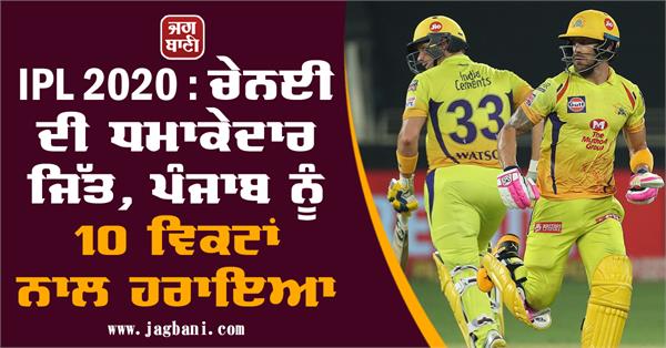 ਦੁਬਈ- ਲੈਅ 'ਚ ਵਾਪਸ ਆਏ ਸ਼ੇਨ ਵਾਟਸਨ (ਅਜੇਤੂ 83), ਫਾਫ ਡੂ ਪਲੇਸਿਸ (ਅਜੇਤੂ 87) ਦੇ ਸ਼ਾਨਦਾਰ ਅਰਧ ਸੈਂਕੜਿਆਂ ਅਤੇ ਇਨ੍ਹਾਂ ਵਿਚਾਲੇ 181 ਦੌੜਾਂ ਦੀ ਓਪਨਿੰਗ ਸਾਂਝੇਦਾਰੀ ਦੀ ਬਦੌਲਤ ਚੇਨਈ ਸੁਪਰ ਕਿੰਗਜ਼ ਨੇ ਕਿੰਗਜ਼ ਇਲੈਵਨ ਪੰਜਾਬ ਨੂੰ 10 ਵਿਕਟਾਂ ਨਾਲ ਹਰਾ ਦਿੱਤਾ।