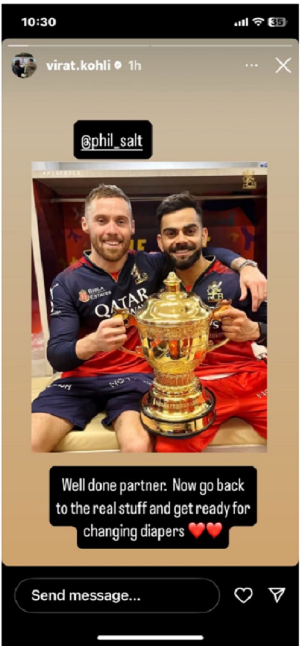 ਦਰਅਸਲ, ਫਾਈਨਲ ਤੋਂ ਪਹਿਲਾਂ, ਅਜਿਹੀਆਂ ਰਿਪੋਰਟਾਂ ਸਨ ਕਿ ਫਿਲ ਸਾਲਟ ਆਰਸੀਬੀ ਲਈ ਉਪਲਬਧ ਨਹੀਂ ਹੋਵੇਗਾ ਕਿਉਂਕਿ ਉਹ ਪਿਤਾ ਬਣਨ ਜਾ ਰਿਹਾ ਸੀ। ਪਰ ਫਾਈਨਲ ਦੀ ਸਵੇਰ, ਉਹ ਬੈਂਗਲੁਰੂ ਕੈਂਪ ਵਿੱਚ ਵਾਪਸ ਆਇਆ ਅਤੇ ਪੰਜਾਬ ਵਿਰੁੱਧ 9 ਗੇਂਦਾਂ 'ਤੇ 16 ਦੌੜਾਂ ਬਣਾਈਆਂ। ਭਾਵੇਂ ਪਾਰੀ ਲੰਬੀ ਨਹੀਂ ਸੀ, ਪਰ ਉਸਦੀ ਮੌਜੂਦਗੀ ਨੇ ਟੀਮ ਨੂੰ ਮਜ਼ਬੂਤੀ ਦਿੱਤੀ। ਜਿੱਤ ਤੋਂ ਬਾਅਦ, ਕੋਹਲੀ ਨੇ ਇੰਸਟਾਗ੍ਰਾਮ 'ਤੇ ਸਾਲਟ ਨਾਲ ਇੱਕ ਤਸਵੀਰ ਸਾਂਝੀ ਕੀਤੀ ਅਤੇ ਲਿਖਿਆ "ਸ਼ਾਬਾਸ਼ ਸਾਥੀ, ਹੁਣ ਆਪਣੇ ਅਸਲ ਕੰਮ 'ਤੇ ਵਾਪਸ ਜਾਓ ਅਤੇ ਡਾਇਪਰ ਬਦਲਣ ਲਈ ਤਿਆਰ ਹੋ ਜਾਓ।" ਪੋਸਟ ਸੋਸ਼ਲ ਮੀਡੀਆ 'ਤੇ ਵਾਇਰਲ ਹੋ ਗਈ ਅਤੇ ਪ੍ਰਸ਼ੰਸਕ ਕੋਹਲੀ ਦੇ ਹਿਊਮਰ ਦੀ ਪ੍ਰਸ਼ੰਸਾ ਕਰਦੇ ਦੇਖੇ ਗਏ।