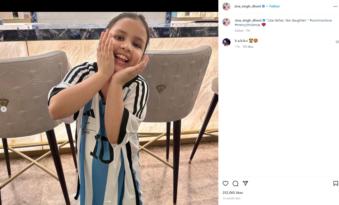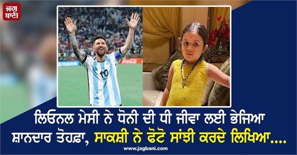 ਸਪੋਰਟਸ ਡੈਸਕ: ਅਰਜਨਟੀਨਾ ਨੂੰ 36 ਸਾਲ ਬਾਅਦ ਵਿਸ਼ਵ ਕੱਪ ਦਾ ਖ਼ਿਤਾਬ ਜਿਤਾਉਣ ਵਾਲੇ ਆਲ ਟਾਈਮ ਗ੍ਰੇਟ ਫੁੱਟਬਾਲਰ ਲਿਓਨਲ ਮੇਸੀ ਨੇ ਸਾਬਕਾ ਭਾਰਤੀ ਕਪਤਾਨ ਮਹਿੰਦਰ ਸਿੰਘ ਧੋਨੀ ਦੀ ਧੀ ਜੀਵਾ ਧੋਨੀ ਨੂੰ ਆਪਣੇ ਦਸਤਖ਼ਤ ਵਾਲੀ ਜਰਸੀ ਭੇਂਟ ਕੀਤੀ ਹੈ। ਜੀਵਾ ਨੇ ਆਪਣੇ ਇੰਸਟਾਗ੍ਰਾਮ ਅਕਾਊਂਟ 'ਤੇ 2 ਤਸਵੀਰਾਂ ਪੋਸਟ ਕੀਤੀਆਂ ਹਨ, ਜਿਸ 'ਚ ਉਹ ਮੈਸੀ ਵੱਲੋਂ ਗਿਫ਼ਟ ਕੀਤੀ ਗਈ ਜਰਸੀ ਨਜ਼ਰ ਆ ਰਹੀ ਹੈ। ਉਥੇ ਹੀ ਧੋਨੀ ਦੀ ਪਤਨੀ ਸਾਕਸ਼ੀ ਨੇ ਇਸ ਦੀ ਕੈਪਸ਼ਨ ਵਿਚ ਲਿਖਿਆ, “Like father, like daughter! “