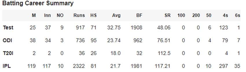ਇਹ ਪਾਰਥਿਵ ਪਟੇਲ ਦਾ 25ਵਾਂ ਟੈਸਟ ਸੀ, ਜਿਸ ਦੀਆਂ 37 ਪਾਰੀਆਂ ਦਾ ਜੇਕਰ ਵਿਸ਼ਲੇਸ਼ਣ ਕਰੀਏ ਤਾਂ ਇਕ ਵੀ ਸੈਂਕੜਾ ਨਜ਼ਰ ਨਹੀਂ ਆਉਂਦਾ ਹੈ। ਪਾਰਥਿਵ ਨੇ ਆਪਣੇ ਟੈਸਟ ਕਰੀਅਰ 'ਚ 6 ਅਰਧ ਸੈਂਕੜੇ ਜ਼ਰੂਰ ਲਗਾਏ ਹਨ। ਪਰ ਇਸ ਨੂੰ ਉਹ ਸੈਂਕੜੇ 'ਚ ਤਬਦੀਲ ਕਰਨ 'ਚ ਕਦੀ ਸਫਲ ਨਾ ਹੋ ਸਕੇ। ਜੇਕਰ ਅਸੀਂ ਉਨ੍ਹਾਂ ਦੀਆਂ 38 ਵਨਡੇ ਦੀਆਂ 34 ਪਾਰੀਆਂ ਦੀ ਗੱਲ ਕਰੀਏ ਤਾਂ ਪਾਰਥਿਵ ਇੱਥੇ ਵੀ 4 ਅਰਧ ਸੈਂਕੜੇ ਲਗਾ ਚੁੱਕੇ ਹਨ। ਟੀ-20 'ਚ ਉਨ੍ਹਾਂ ਨੂੰ 2 ਵਾਰ ਮੌਕਾ ਦਿੱਤਾ ਗਿਆ, ਜਿਸ 'ਚ ਕੁਲ ਮਿਲਾ ਕੇ ਪਾਰਥਿਵ ਟੀਮ ਲਈ 36 ਦੌੜਾਂ ਹੀ ਬਣਾ ਸਕੇ।