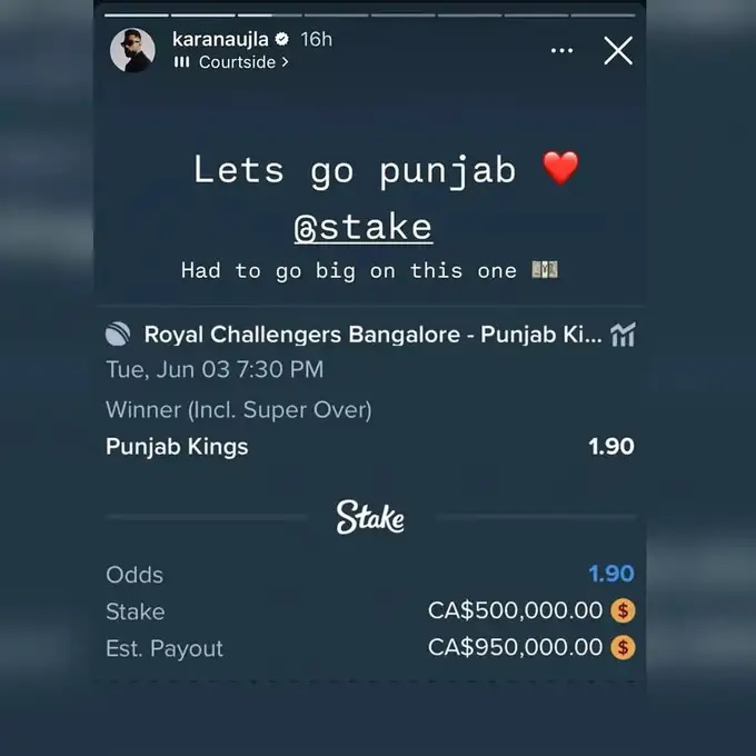 ਮੈਚ ਤੋਂ ਪਹਿਲਾਂ, ਕਰਨ ਔਜਲਾ ਨੇ ਆਪਣੀ ਇੰਸਟਾਗ੍ਰਾਮ ਸਟੋਰੀ 'ਤੇ ਸਾਂਝਾ ਕੀਤਾ ਕਿ ਉਸਨੇ ਪੰਜਾਬ ਕਿੰਗਜ਼ 'ਤੇ 500,000 ਕੈਨੇਡੀਅਨ ਡਾਲਰ ਦਾ ਦਾਅ ਲਗਾਇਆ ਹੈ, ਜੋ ਕਿ ₹3,11,15,000 (ਤਿੰਨ ਕਰੋੜ ਗਿਆਰਾਂ ਲੱਖ ਪੰਦਰਾਂ ਹਜ਼ਾਰ ਰੁਪਏ) ਦੇ ਬਰਾਬਰ ਹੈ। ਉਸਨੇ ਆਪਣੀ ਕਹਾਣੀ ਦਾ ਕੈਪਸ਼ਨ ਦਿੱਤਾ, 'ਚਲੋ ਪੰਜਾਬ ਚੱਲੀਏ।'