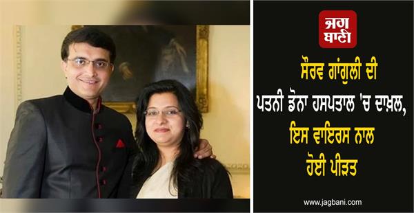 ਕੋਲਕਾਤਾ (ਏਜੰਸੀ)- ਭਾਰਤੀ ਕ੍ਰਿਕਟ ਟੀਮ ਦੇ ਸਾਬਕਾ ਕਪਤਾਨ ਅਤੇ ਭਾਰਤੀ ਕ੍ਰਿਕਟ ਕੰਟਰੋਲ ਬੋਰਡ (ਬੀਸੀਸੀਆਈ) ਦੇ ਪ੍ਰਧਾਨ ਸੌਰਵ ਗਾਂਗੁਲੀ ਦੀ ਪਤਨੀ ਪ੍ਰਸਿੱਧ ਓਡੀਸੀ ਡਾਂਸਰ ਡੋਨਾ ਗਾਂਗੁਲੀ ਨੂੰ ਚਿਕਨਗੁਨੀਆ ਵਾਇਰਸ ਤੋਂ ਪ੍ਰਭਾਵਿਤ ਹੋਣ ਤੋਂ ਬਾਅਦ ਇੱਥੇ ਹਸਪਤਾਲ ਵਿਚ ਦਾਖ਼ਲ ਕਰਾਇਆ ਗਿਆ ਹੈ।