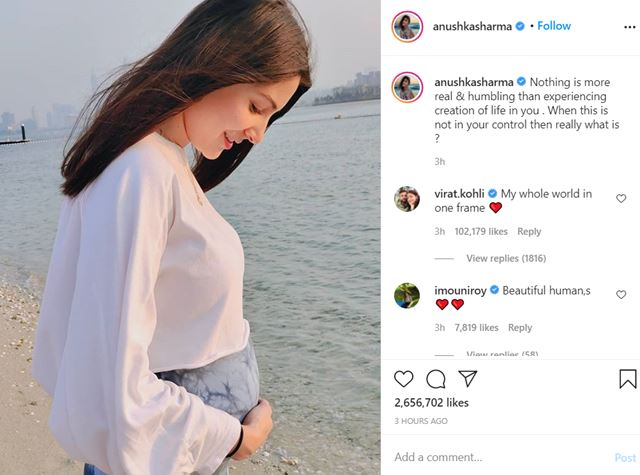 ਅਨੁਸ਼ਕਾ ਸ਼ਰਮਾ ਵਲੋਂ ਸਾਂਝੀ ਕੀਤੀ ਤਸਵੀਰ ਨੂੰ ਦੇਖ ਇੰਝ ਲੱਗਦਾ ਹੈ ਕਿ ਇਹ ਤਸਵੀਰ ਸਮੁੰਦਰ ਤਟ ਦੇ ਕੋਲ ਕਲਿੱਕ ਕੀਤੀ ਗਈ ਹੈ। ਤਸਵੀਰ 'ਚ ਅਨੁਸ਼ਕਾ ਤਿਰਛੀ ਖੜ੍ਹੀ ਹੈ। ਤਸਵੀਰ ਸਾਂਝਾ ਕਰਦਿਆਂ ਕੈਪਸ਼ਨ 'ਚ ਅਨੁਸ਼ਕਾ ਨੇ ਬੱਚੇ ਦੇ ਜਨਮ ਦਾ ਅਨੁਭਵ ਕਰਨ ਬਾਰੇ ਲਿਖਿਆ ਹੈ। ਅਨੁਸ਼ਕਾ ਲਿਖਦੀ ਹੈ, 'ਤੁਹਾਡੇ 'ਚ ਹੋ ਰਹੇ ਜੀਵਨ ਦੇ ਨਿਰਮਾਣ ਦਾ ਅਨੁਭਵ ਕਰਨ ਤੋਂ ਜ਼ਿਆਦਾ ਅਸਲ ਅਤੇ ਸ਼ਿਸ਼ਟ ਕੁਝ ਵੀ ਨਹੀਂ ਹੈ। ਜਦੋਂ ਇਹ ਤੁਹਾਡੇ ਕੰਟਰੋਲ 'ਚ ਨਹੀਂ ਹੈ ਤਾਂ ਅਸਲ 'ਚ ਕੀ ਹੈ? ਉਥੇ ਹੀ ਵਿਰਾਟ ਕੋਹਲੀ ਨੇ ਕੁਮੈਂਟ ਕਰਦੇ ਹੋਏ ਲਿਖਿਆ ਹੈ, 'ਇਸ ਇੱਕ ਫਰੇਮ 'ਚ ਮੇਰੀ ਪੂਰੀ ਦੁਨੀਆ ਹੈ।'